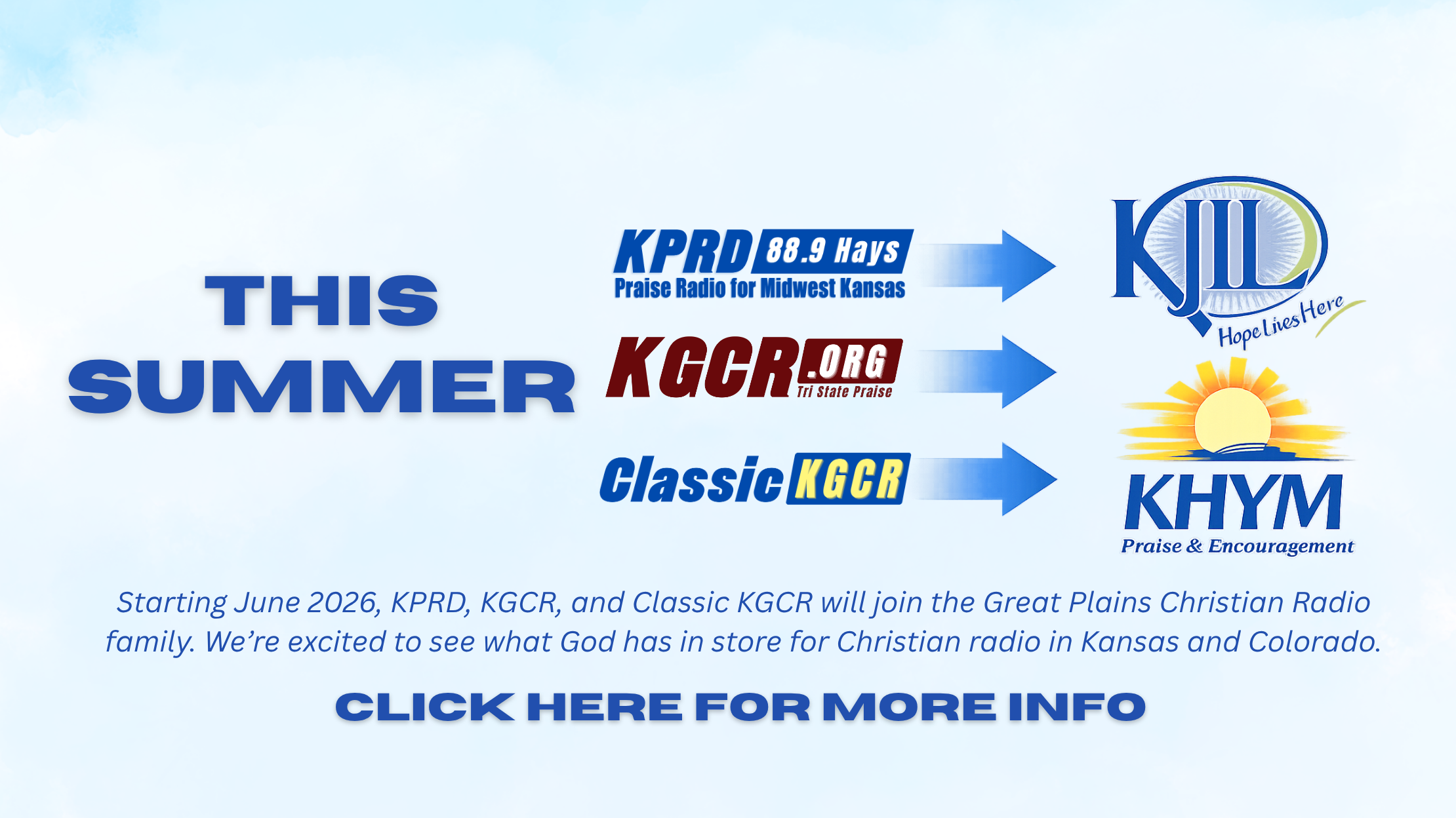 PUBLIC NOTICE: On March 25, 2026, The Praise Network, Inc., licensee of KGCR, 107.7 FM, Goodland, Kansas; KGCD, 90.3 FM, Wray, Colorado; K203DL, 88.5 FM, Cheyenne Wells, Colorado; KZCK, 88.1 FM, Colby, Kansas; KGCB, 89.5 FM, Wray, Colorado; KGCY, 89.1 FM, Cheyenne Wells, Colorado; K214AU, 90.7 FM, Sharon Springs, Kansas; KPRD, 88.9 FM, Hays, Kansas; KPBL, 89.9 FM, Beloit, Kansas; KHLC, 89.3 FM, Hill City, Kansas; KPSR, 89.3 FM, Smith Center, Kansas; K216ED, 91.1 FM, Phillipsburg, Kansas; K278AP, 103.5 FM, Lewis, Kansas; and K241AN, 96.1 FM, Pratt, Kansas, filed applications with the Federal Communications Commission for consent to assign the stations to Great Plains Christian Radio, Inc.