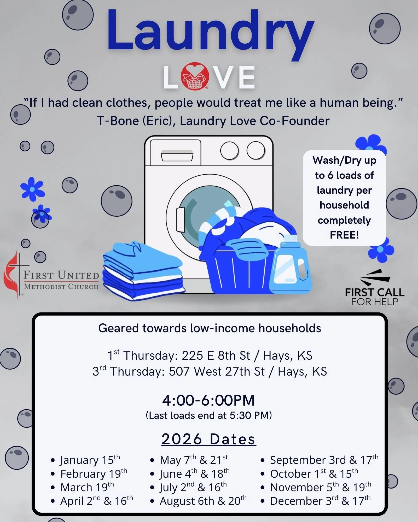 3rd Thursday: 507 W. 27th St. HaysHosted by First Call for Help of Ellis County & First United Methodist Church - Follow them on FB for more details